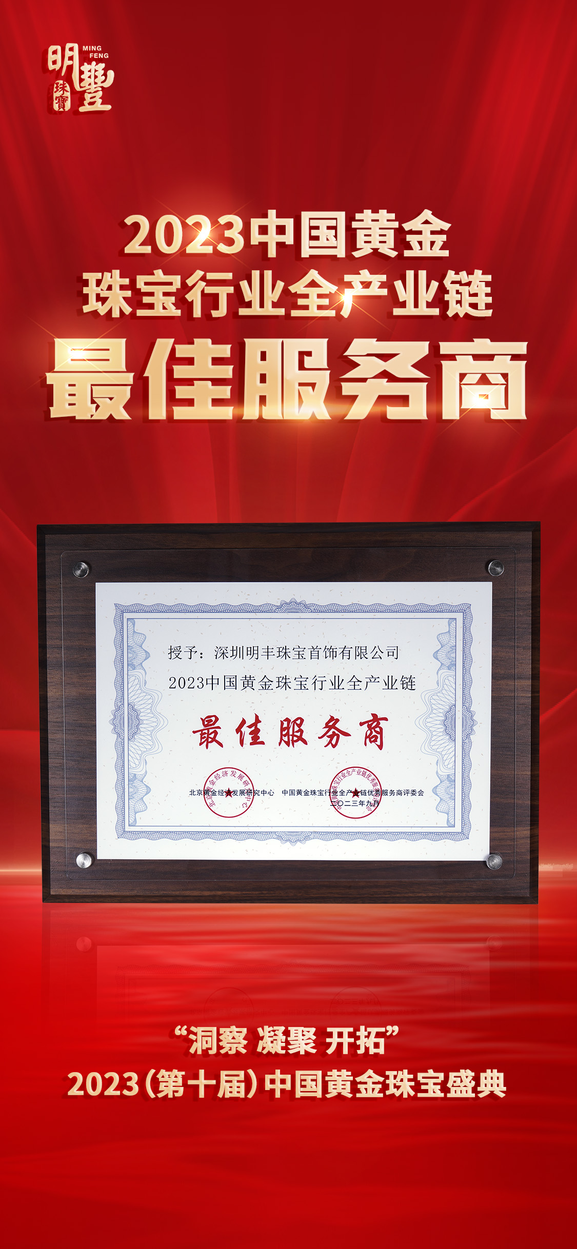 盛典上《2023中國(guó)黃金珠寶行業(yè)全產(chǎn)業(yè)鏈優(yōu)秀服務(wù)商名錄》正式發(fā)布,明豐珠寶斬獲“2023中國(guó)黃金珠寶行業(yè)產(chǎn)業(yè)鏈-最佳服務(wù)商”榮譽(yù)稱號(hào)。
